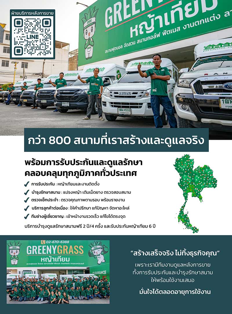 Greeny Grass is the No. 1 leader in comprehensive Artificial Grass Football Field Construction. With over 18 years of accumulated experience and the highest number of installation results in Thailand, totaling more than 800 fields. We specialize in all types of field construction, from commercial football rental businesses and leading school fields to government agencies and international standard fields that have passed FIFA testing.