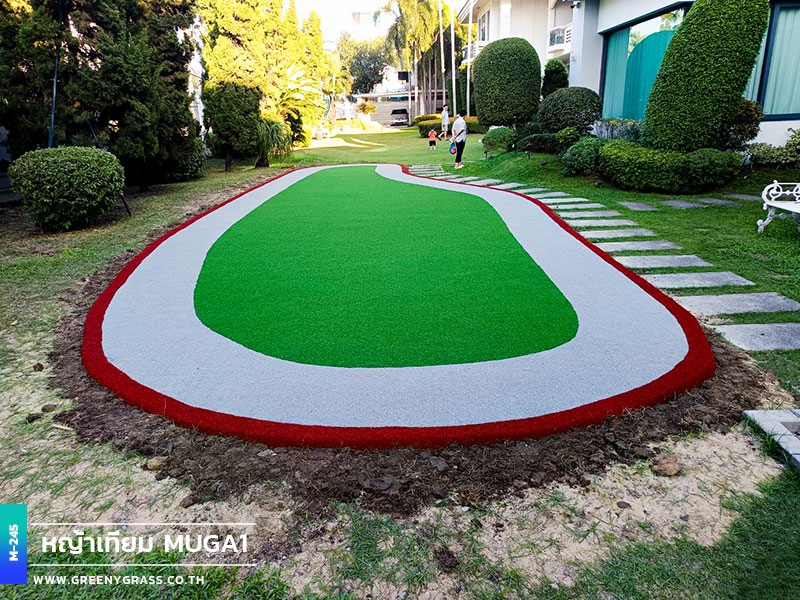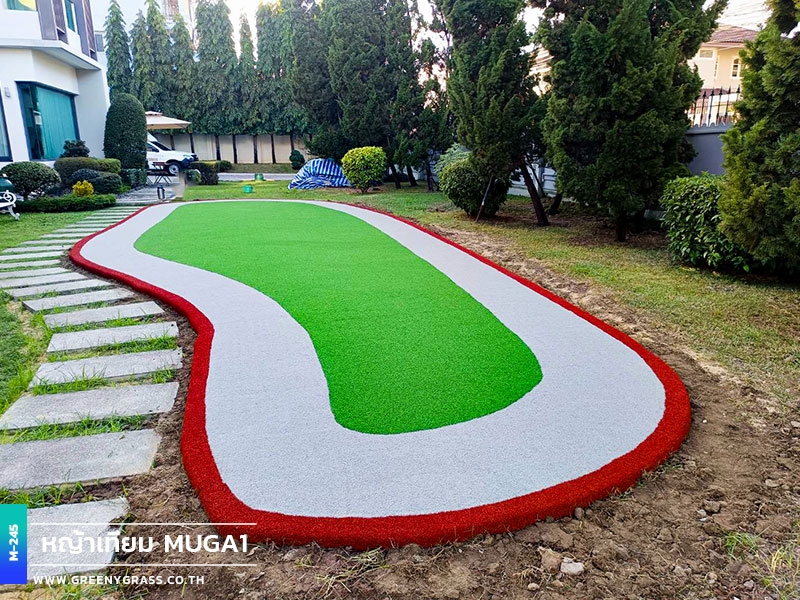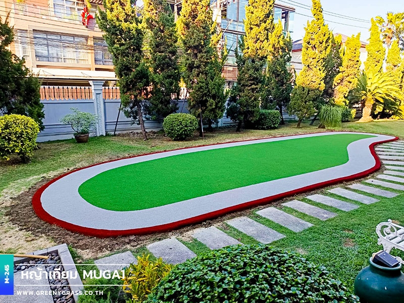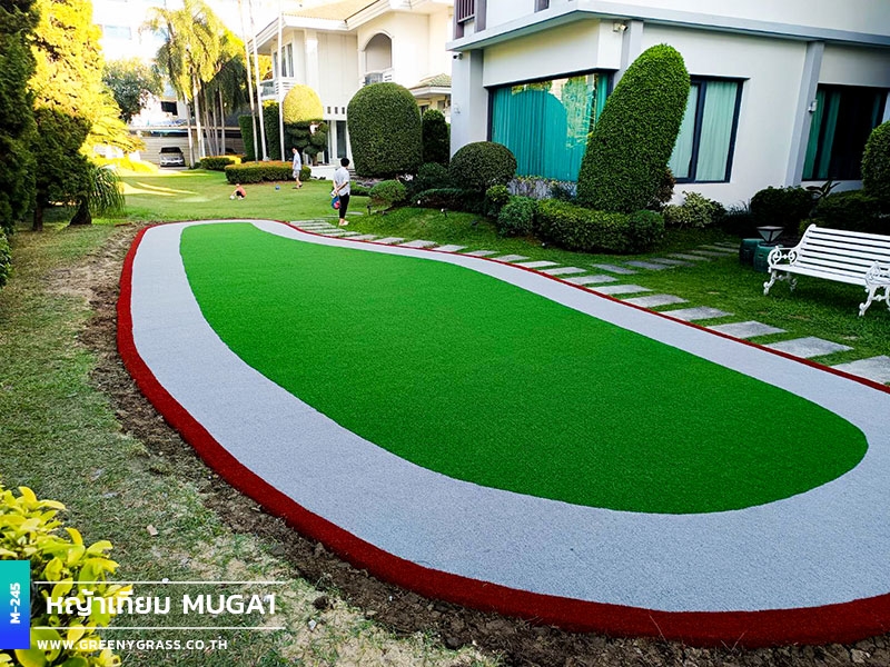 พื้นที่ออกกำลังกาย บ้านพักถนนศรีนครินทร์ ถูกออกแบบเพื่อรองรับการใช้งานได้จริง ตอบโจทย์ทั้งการออกกำลังกาย การวิ่งเล่นของเด็ก ๆ หรือแม้แต่การเป็นมุมพักผ่อนกลางสวน ดีไซน์สนามรูปทรงโค้งมนช่วยให้พื้นที่ดูนุ่มนวล สบายตา และกลมกลืนกับภูมิทัศน์โดยรอบ ช่วยสร้างมิติให้พื้นที่ดูโดดเด่น แตกต่างจากสนามหญ้าแบบทั่วไป