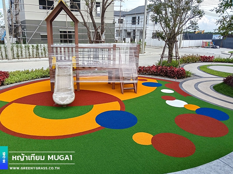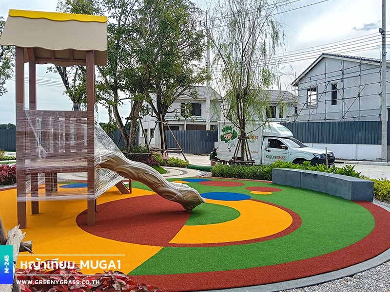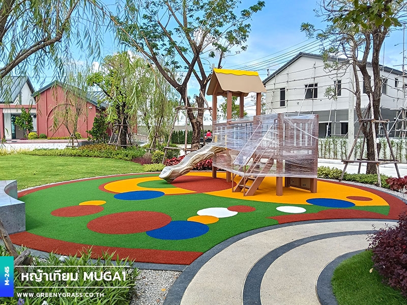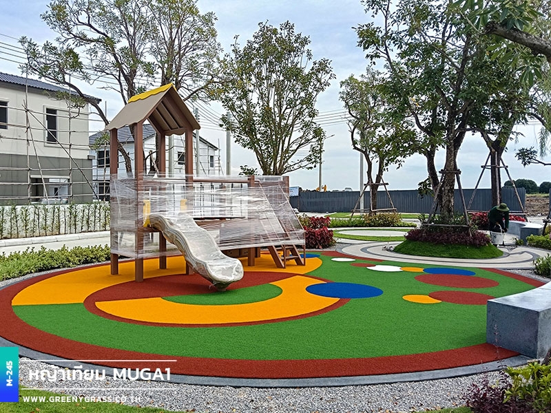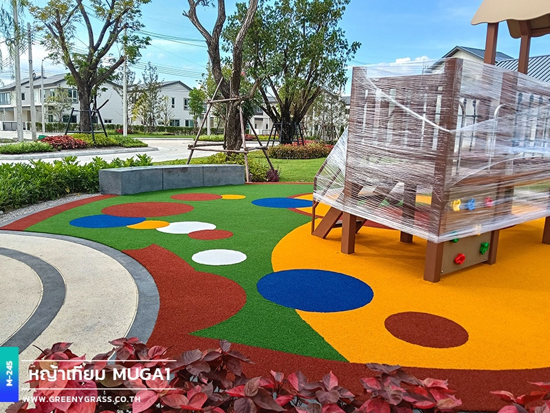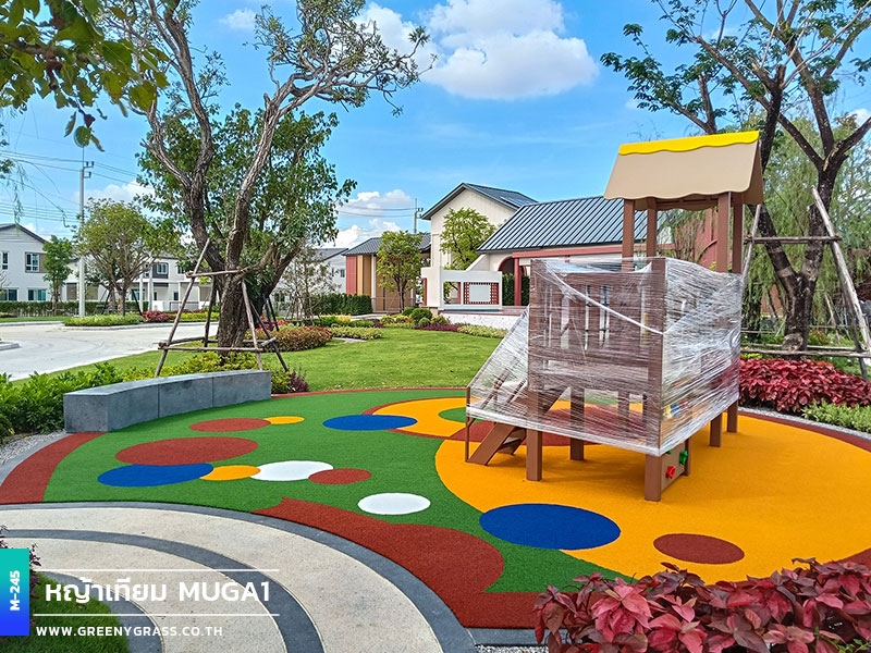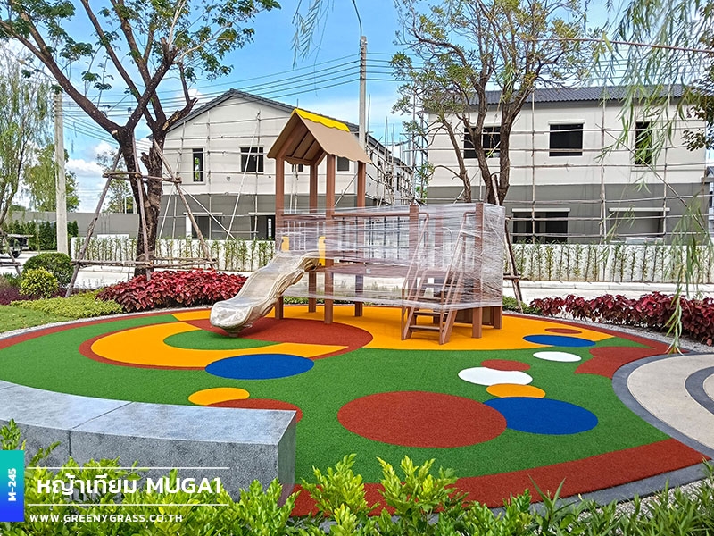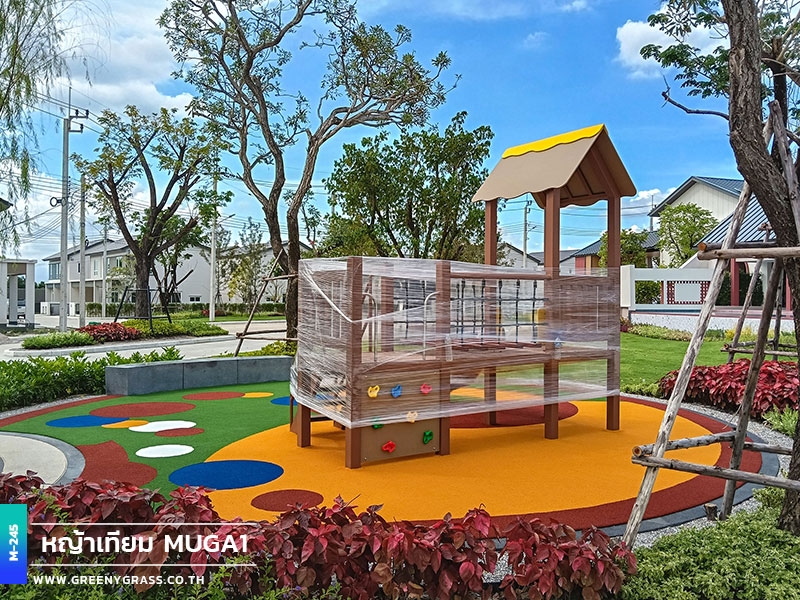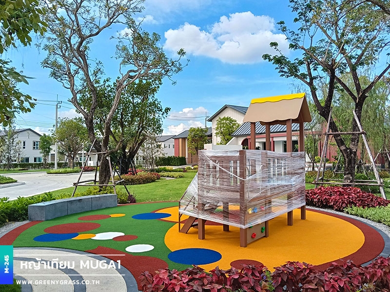 ลานเด็กเล่น โครงการเมเบิล ประชาอุทิศ 90 ใช้พื้นสนามหญ้าอเนกประสงค์สีสันสดใส ให้ความนุ่มยืดหยุ่น ลดแรงกระแทกได้ดีขณะใช้งาน พื้นผิวมีความทนทานต่อแดดและฝน สีไม่ซีดง่าย ช่วยให้พื้นที่นี้พร้อมใช้งานได้ทุกวัน ทั้งสนุก ปลอดภัยและสวยงามยาวนาน