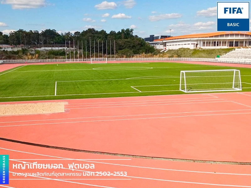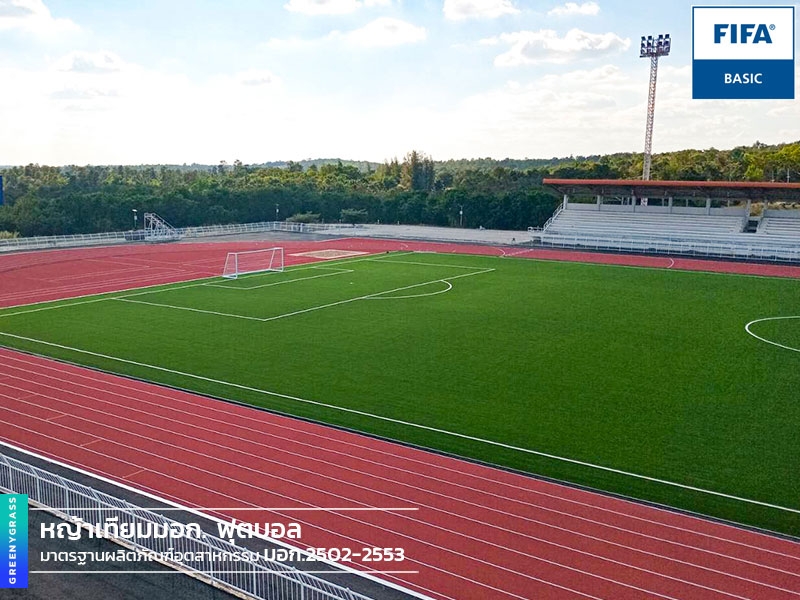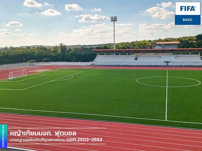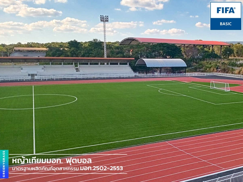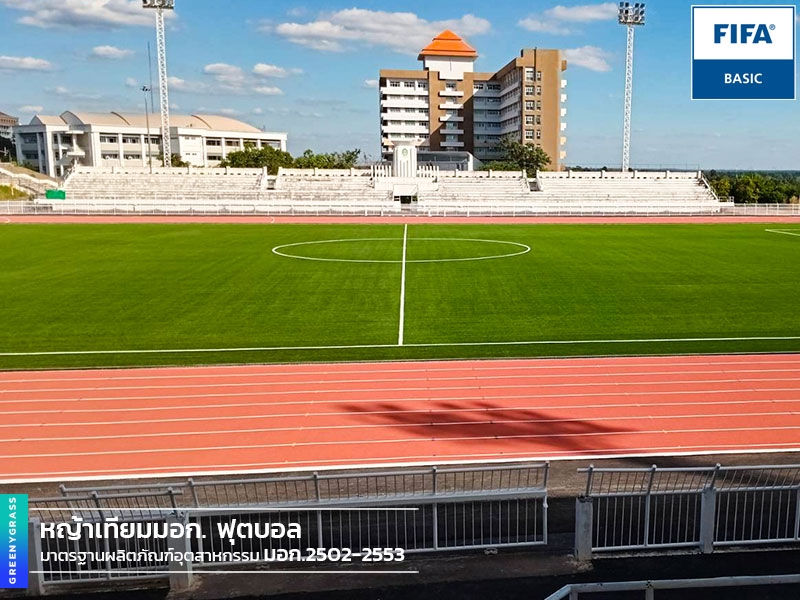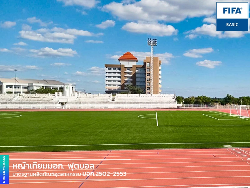 Stadium at Chaiyaphum Rajabhat University was developed as a large-scale sports facility designed to support training sessions, competitions, and sports activities for students and staff with maximum efficiency. The field is installed with football artificial grass that meets the Thai Industrial Standard TIS 2502-2553, featuring a 6 cm pile height. It is specifically designed for continuous use, offering softness, resilience, and durability to keep the field ready for use at all times.