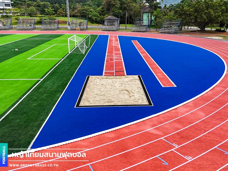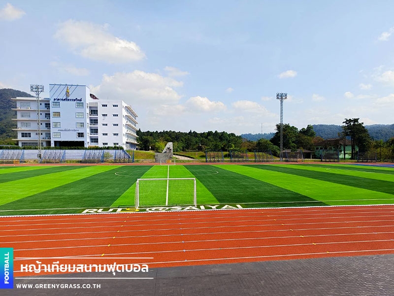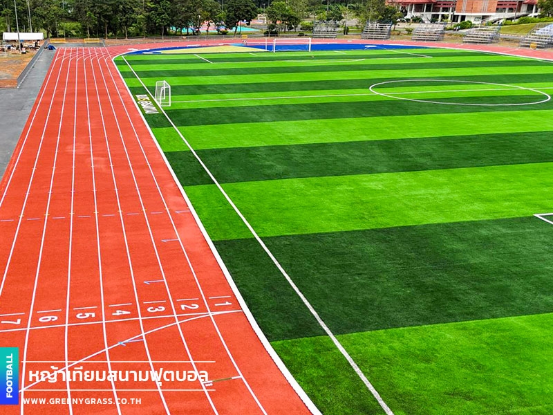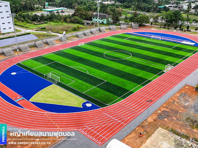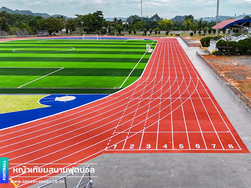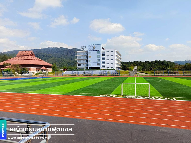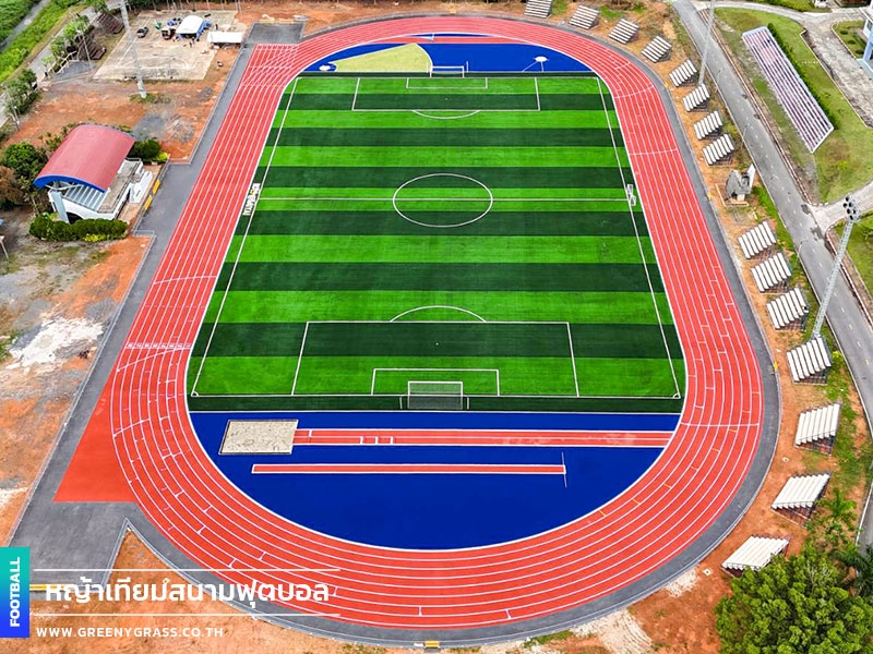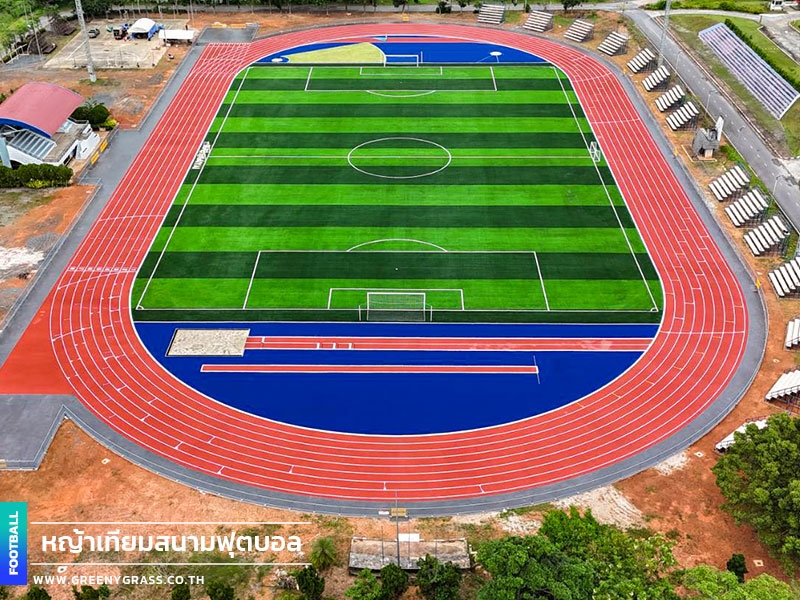 Football field at Rajamangala University of Technology Srivijaya was developed to elevate the standard of the sports facility with a high-quality design that fully supports teaching, training, and competitive sports. The field features a modern and visually appealing layout, highlighted by alternating shades of green turf that enhance the clarity of the playing area. The surrounding running track also adds a distinctive character to the stadium. Every aspect of the design was planned with performance, athlete safety, and long-term durability in mind.