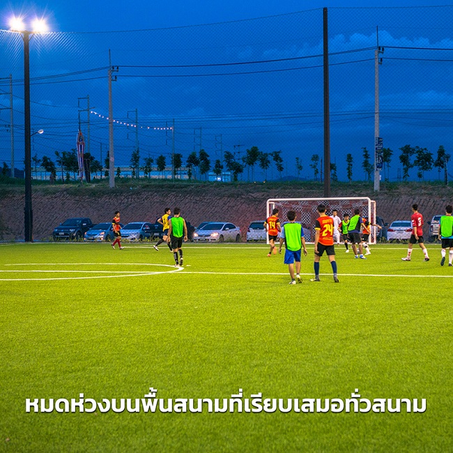 นักเตะสัมผัสได้ทันทีที่เท้าแตะพื้น! สนามที่ใช้หญ้าเกรดพรีเมียมมาตรฐาน FIFA จะมีความหนานุ่ม วิ่งแล้วรองรับน้ำหนักได้ดี ไม่รู้สึกแข็งกระด้าง ช่วยให้คอนโทรลบอลได้ดั่งใจเหมือนเตะในสนามมาตรฐาน